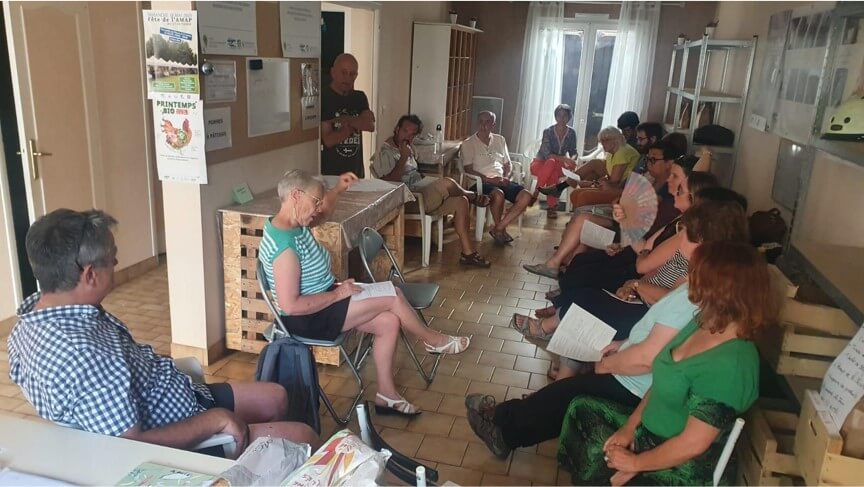 Une quinzaine de personnes se réunissent le 26 juin 2025, au local de l’Amap, pour transformer l’intention en projet et en définir les contours. Le principe étant validé par un vote des adhérents fin août 2025, un groupe de travail se met en place. Les réunions, mensuelles, se succèdent, complétées par trois rencontres avec des partenaires sociaux: centre social Equinoxe, Epicerie solidaire « La Rich’Epice », assistante sociale récemment recrutée sur la commune.